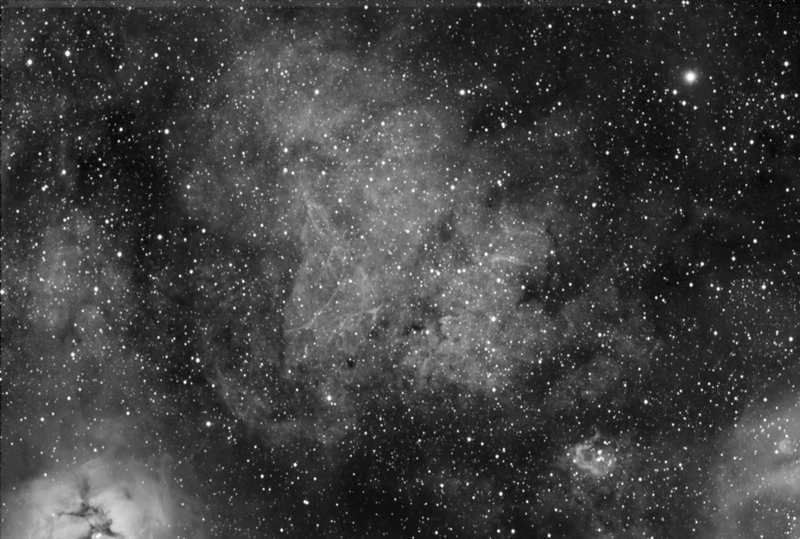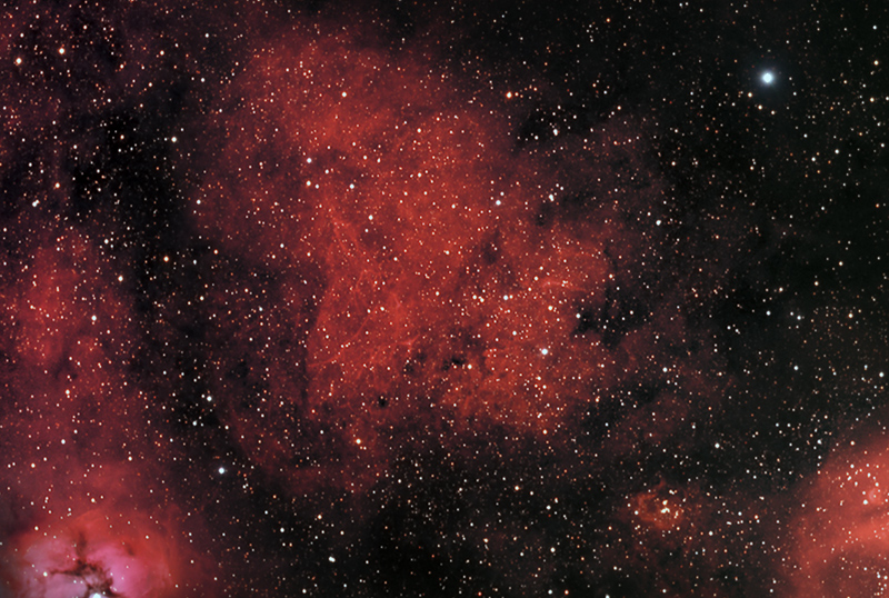 This nice size nebula is usually imaged with the lagoon and trifid nebulae along with a few others. This nebula responds to the hydrogen-alpha very well but very weak with standard RGB color filters. So if you do an RGB color you will need a long exposure time. I blended the H-Alpha channel with the red and blue image to create this HA-RGB image. The sulfur II filter does well here but lacks with the oxygen III.